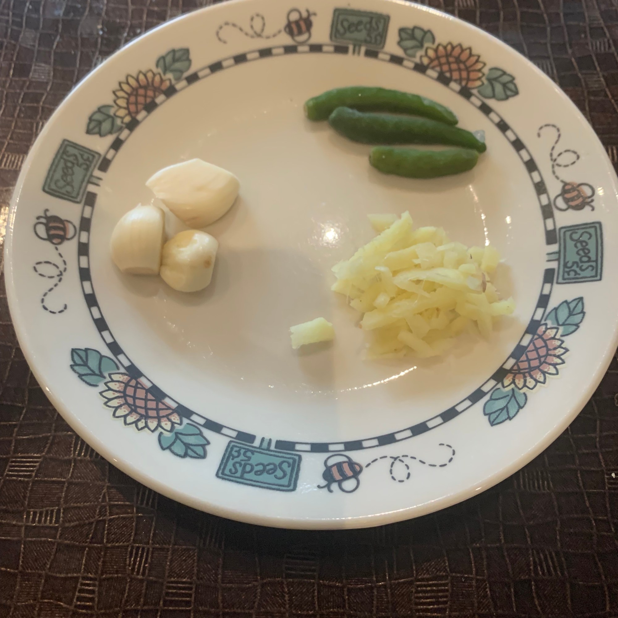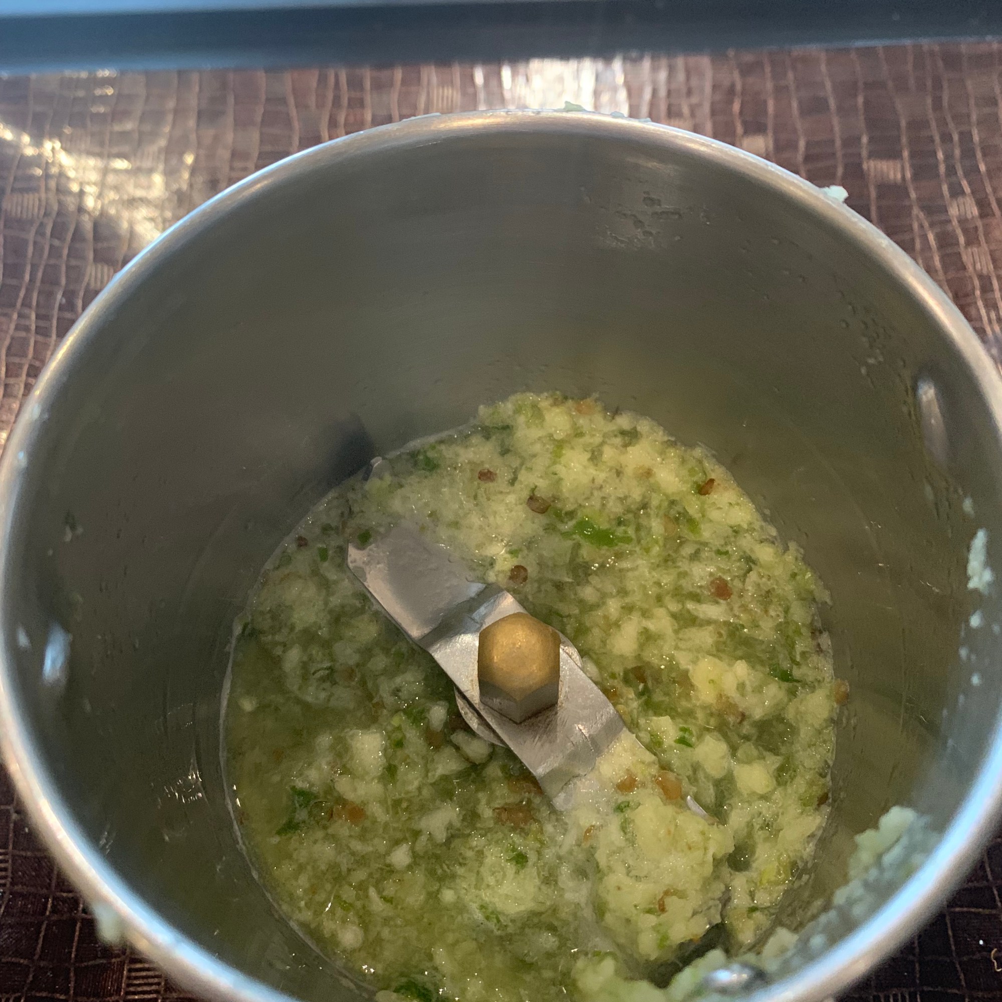 - Grind the green chillies, garlic and ginger into a coarse paste using little water if necessary.
