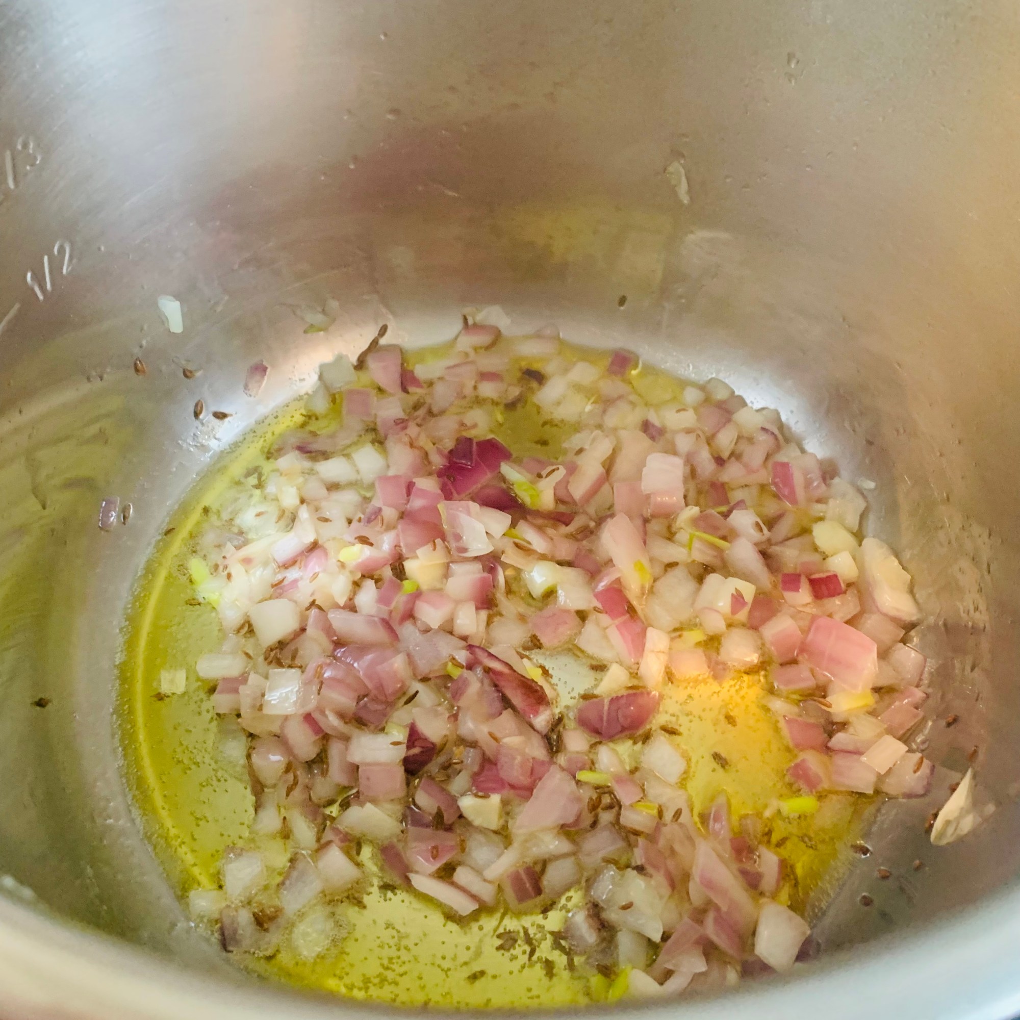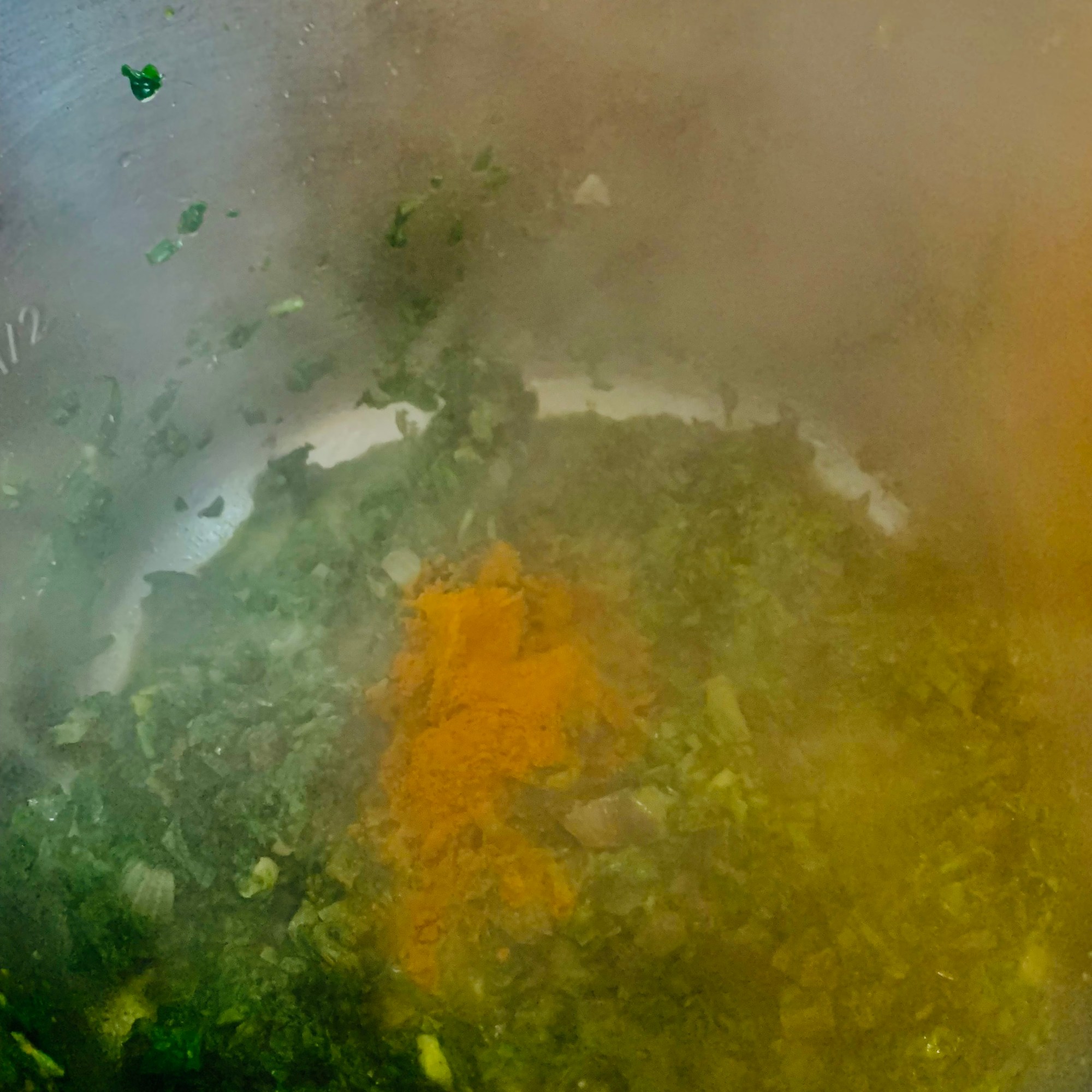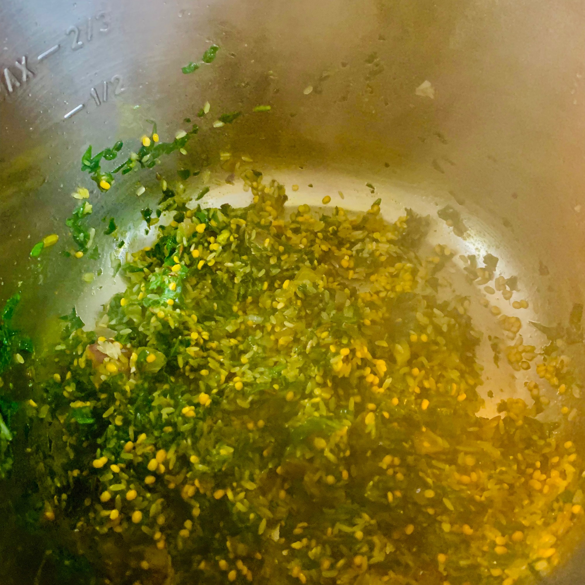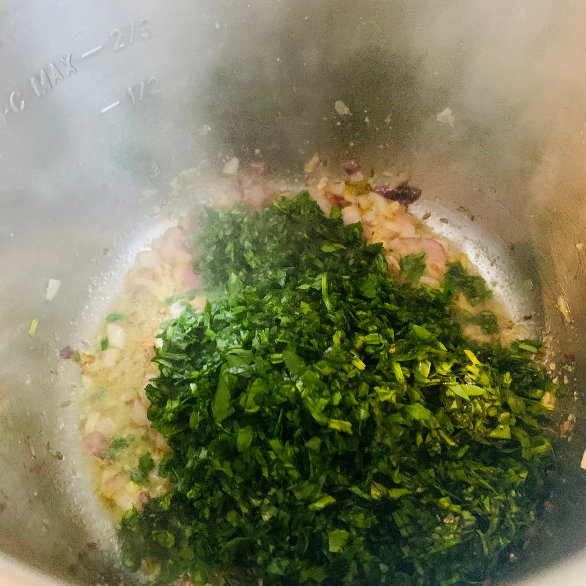 - To prepare the palak kitchadi in an instant pot – Keep all the ingredients ready by the side. Keep the instant pot setting in saute` mode. If there is any moisture in the lining pot, then allow it to dry. Now add 1 tablespoon of oil and 1 tablespoon ghee. Add 1 teaspoon jeera / cumin seeds. Now add the green chilli-ginger-garlic ground paste and saute` for few seconds or until the raw smell goes away. Add the chopped spinach leaves and saute` for 1 – 2 minutes.