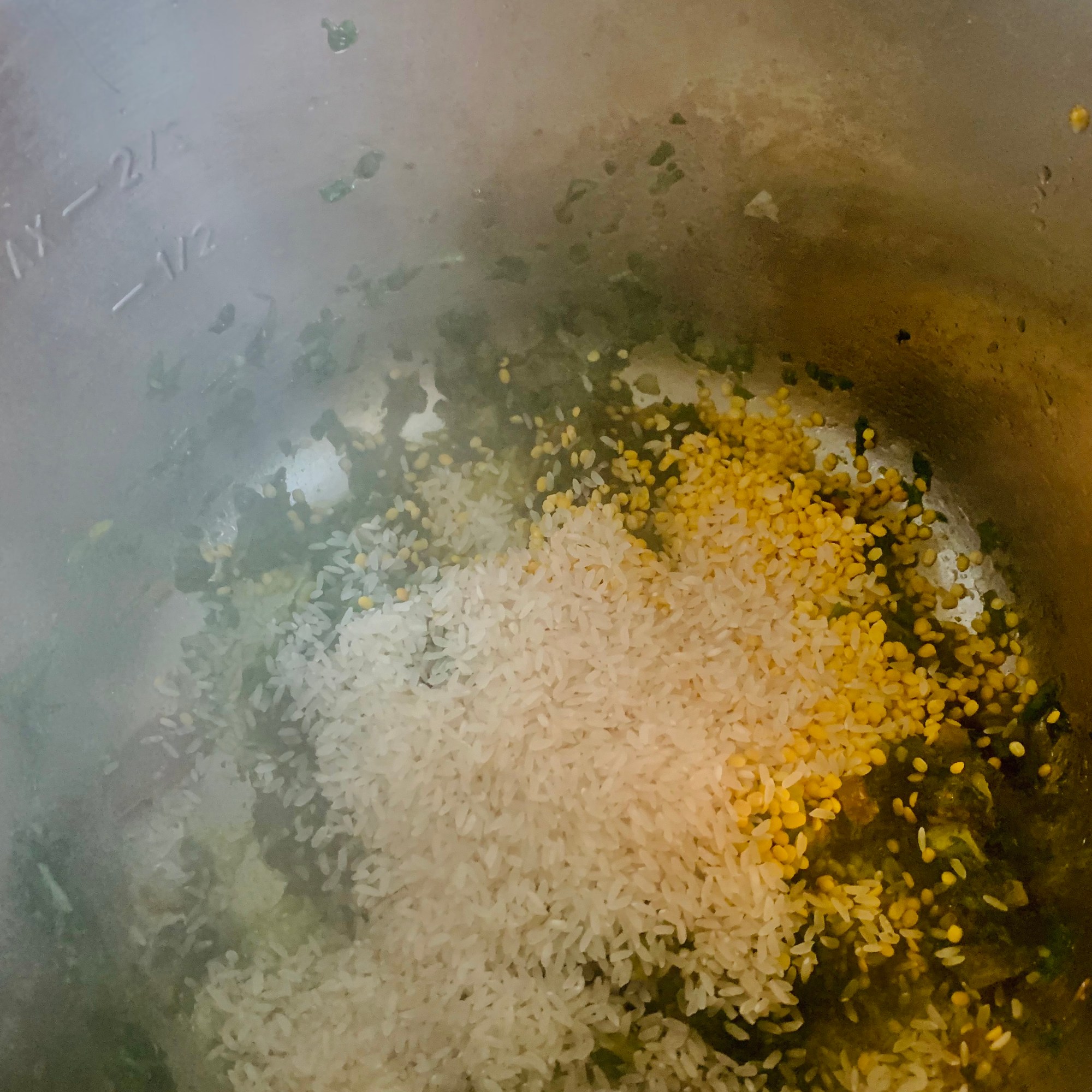 - To prepare the Palak Kitchadi in a pressure cooker – Place the pressure cooker on the stove and keep the flame low. Allow the heat to evenly spread so that all the moisture is absorbed. Add 1 tablespoon ghee and 1 tablespoon oil. Add 1 teaspoon jeera / cumin seeds. Add green chilli-ginger-garlic paste and saute` for few seconds or cook until the raw smell goes away. Add the chopped spinach leaves and saute` for 1 – 2 minutes. Add hing and turmeric powder and give a quick stir. Now add the washed moong dhal and rice and saute` for few seconds. Add salt. Add about 2 1/2 cups of water. Mix the contents well so that the ingredients are mixed well. Close the pressure cooker with a lid and place the weight. Pressure cook for 3 to 4 whistles.