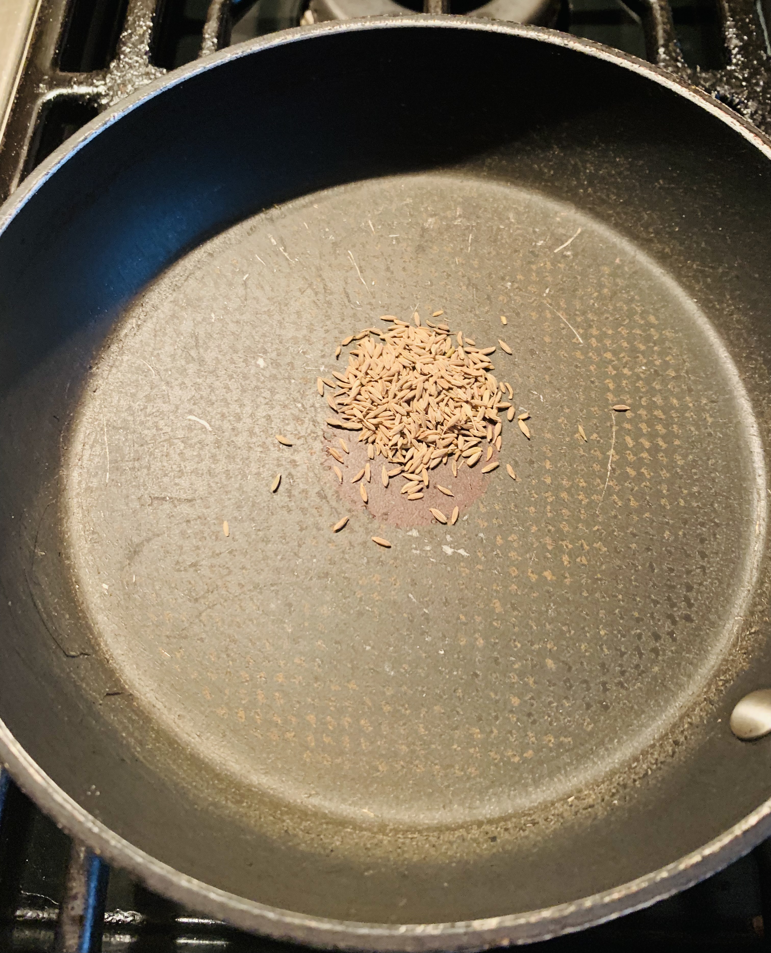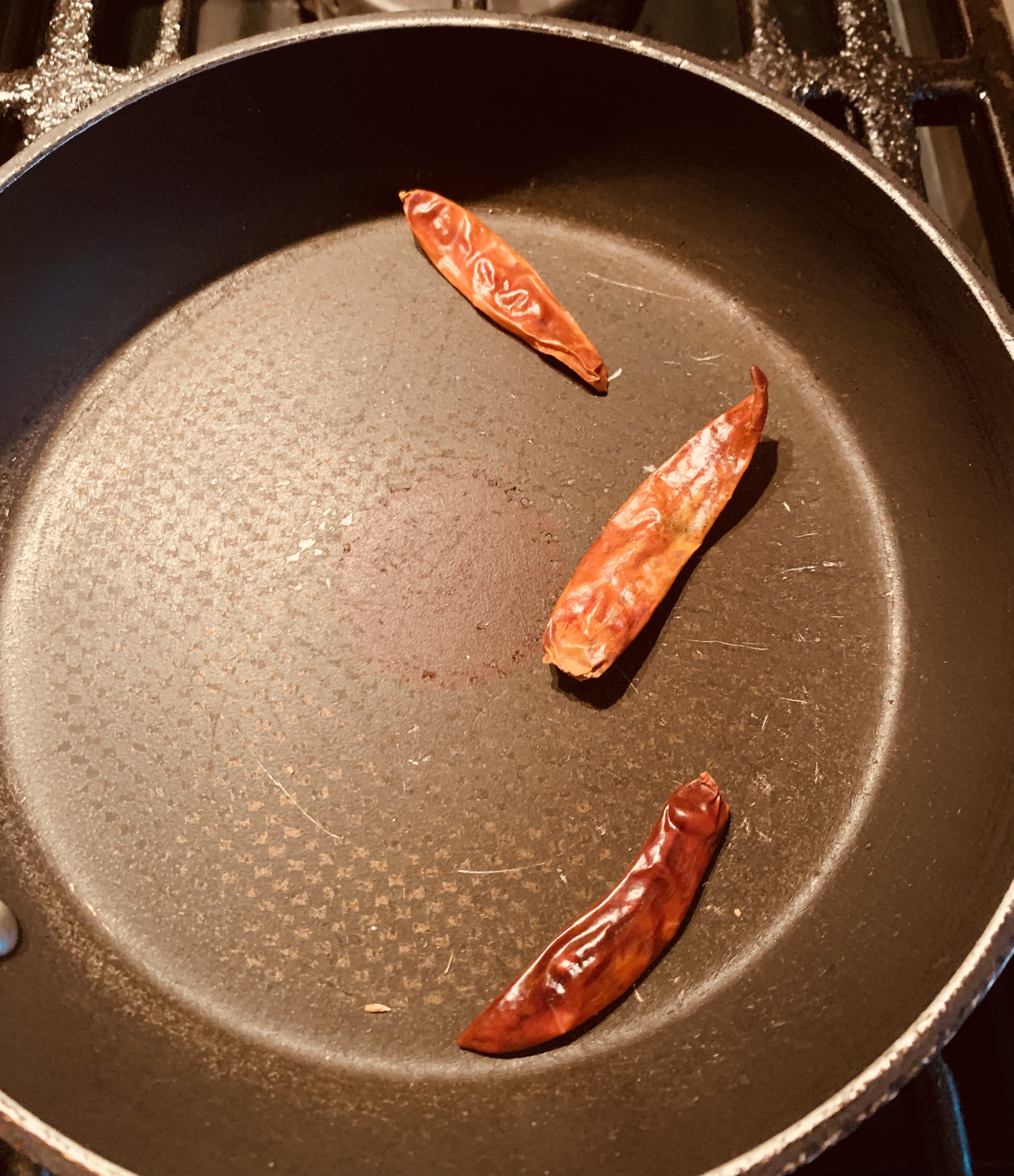- Dry roasting cumin seeds, red chillies and hing- To the same pan, roast the cumin seeds in low heat for about 30 seconds or until it leaves a good aroma. Transfer the cumin seeds to the plate containing the lentils. Now add the red chillies, roast in low heat with continuous stirring for about 20 to 30 seconds. The chillies should not change colour. If the chillies get charred or blackened, then this will alter the taste of the paruppu podi. Transfer the roasted chillies to the plate containing the other ingredients. In the same pan, roast the hing/ asafoetida for 20 seconds. Transfer to a plate.